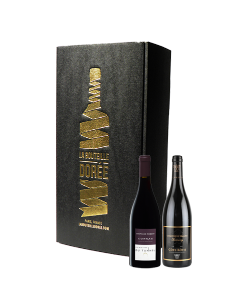 Voici un coffret vin avec 2 bouteilles de vins rouges de la Vallée du Rhône septentrionale, 100% Syrah, en appellation Cornas et Côte-Rôtie, sélectionnées par La Bouteille Dorée et qui seront placées dans une belle boite cadeau noire et dorée.